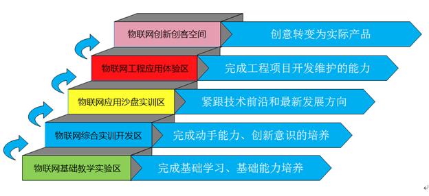 實(shí)驗室建設的總體發(fā)展思路是以“任務(wù)引領(lǐng)、項目驅動(dòng)、創(chuàng )新設計、服務(wù)科教”為宗旨,著(zhù)眼物聯(lián)網(wǎng)產(chǎn)業(yè)鏈的需求和人才培養的需求,緊密?chē)@物聯(lián)網(wǎng)的關(guān)鍵技術(shù)和最新技術(shù),從基礎理論與方法、實(shí)訓平臺驗證與開(kāi)發(fā)、典型示范應用等三個(gè)層次著(zhù)手,根據“鞏固教學(xué)、學(xué)做同行、學(xué)科競賽、科研創(chuàng )新、畢業(yè)設計”的建設目標,按照物聯(lián)網(wǎng)的三層體系結構,將物聯(lián)網(wǎng)實(shí)驗室規劃為“基礎教學(xué)實(shí)驗區、 物聯(lián)網(wǎng)綜合實(shí)訓開(kāi)發(fā)區、物聯(lián)網(wǎng)應用沙盤(pán)實(shí)訓區、創(chuàng )客空間實(shí)訓區”。