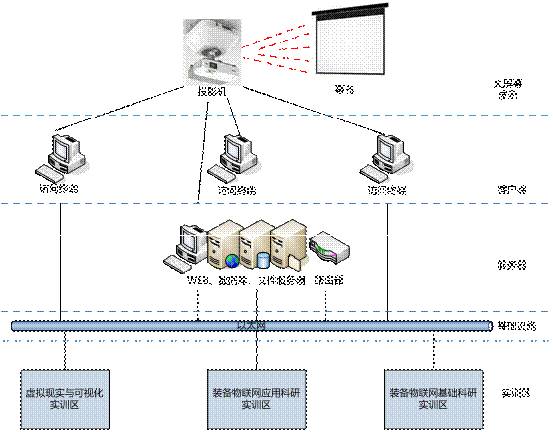 實(shí)驗室由三個(gè)實(shí)驗區組成:即:裝備物聯(lián)網(wǎng)基礎科研實(shí)驗區、裝備物聯(lián)網(wǎng)應用實(shí)驗區、MGIS可視化及虛擬現實(shí)科研實(shí)驗區。其構成情況如圖3-1所示。