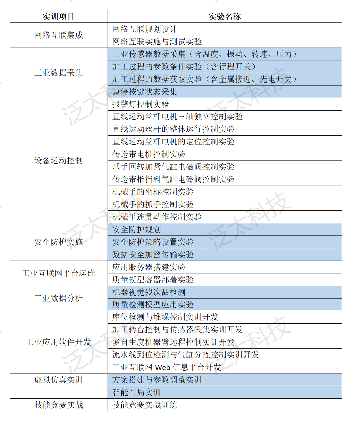 典型的實(shí)訓項目類(lèi)別和實(shí)驗名稱(chēng)如下表所示。