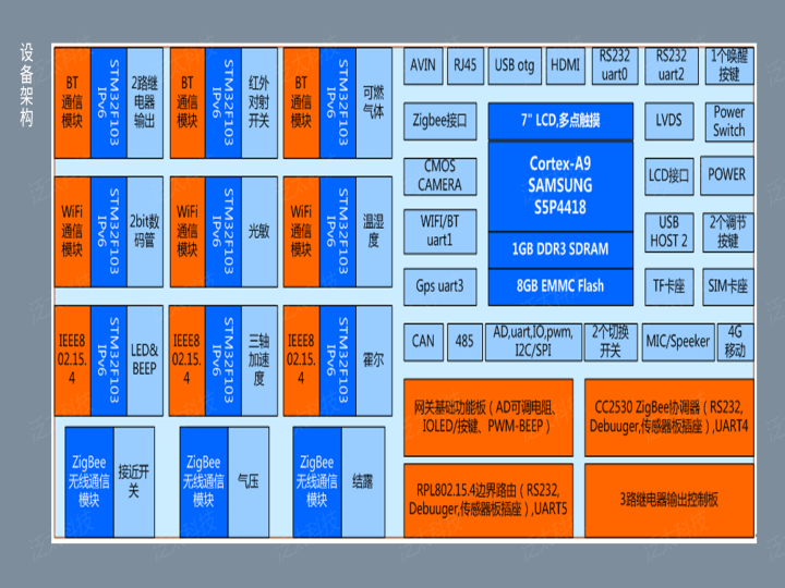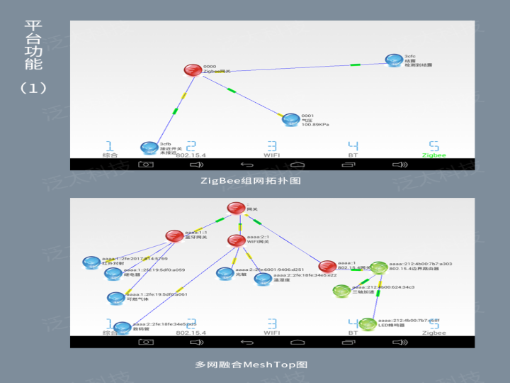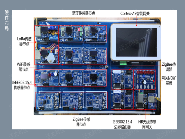 無(wú)線(xiàn)傳感網(wǎng)實(shí)驗箱(型號:SeaIOT-B-WSN-02),集成WiFi、Bluetooth、IEEE802.15.4、ZigBee等多種短距離無(wú)線(xiàn)通訊模塊,將6LowPAN(IPv6)互聯(lián)網(wǎng)協(xié)議移植到短距離無(wú)線(xiàn)通信網(wǎng)絡(luò )中,與ZigBee傳感網(wǎng)使用的ZStack協(xié)議棧并存,共同支持雙協(xié)議棧,實(shí)現傳感器節點(diǎn)可唯一尋址。采用三星Cortex-A9四核處理器作為智能網(wǎng)關(guān),支持6LowPAN和Z-Stack雙協(xié)議解析,具有1GB內存、8GB大容量存儲空間、7寸電容觸摸顯示屏、豐富的外圍接口,板載WIFI/BT二合一通訊模塊,具有GPS、移動(dòng)通訊接口,內嵌Android、Linux雙系統,可一鍵切換。