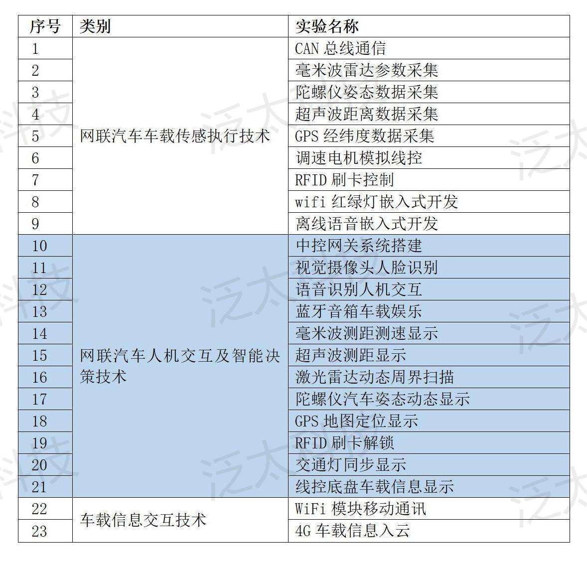 采用體驗型車(chē)載傳感器、M3嵌入式處理器、Ubuntu中控網(wǎng)關(guān),結合傳感器應用技術(shù)、嵌入式應用技術(shù)、CAN總線(xiàn)通信技術(shù)、網(wǎng)絡(luò )通信技術(shù)、Python圖形化應用開(kāi)發(fā)等,實(shí)現激光雷達掃描、毫米波雷達測距、超聲波測距、陀螺儀姿態(tài)檢測、藍牙音箱、語(yǔ)音識別、視覺(jué)識別、RFID刷卡解鎖、車(chē)輛行駛方式控制、衛星定位、車(chē)載網(wǎng)關(guān)展示、4G車(chē)載數據上云等功能。系統提供《智能網(wǎng)聯(lián)技術(shù)基礎》課程實(shí)驗案例,包括車(chē)載環(huán)境感知技術(shù)、智能人機交互技術(shù)、車(chē)載組網(wǎng)通信技術(shù)、控制執行技術(shù)、汽車(chē)信息交互技術(shù)。