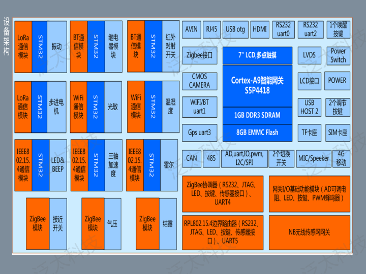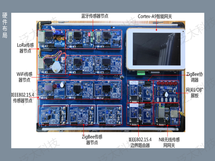 SeaIOT-B-WSN-2A型無(wú)線(xiàn)傳感網(wǎng)全功能實(shí)驗箱是SeaIOT-B-WSN-02型的升級版,集成Bluetooth、WiFi、IEEE802.15.4、ZigBee等短距離無(wú)線(xiàn)通信技術(shù),將6LowPAN(IPv6)互聯(lián)網(wǎng)協(xié)議應用到短距離無(wú)線(xiàn)通信網(wǎng)絡(luò )中,與ZigBee使用的ZStack協(xié)議棧并存,支持雙協(xié)議棧;集成LoRa、NB-IoT等長(cháng)距離無(wú)線(xiàn)通信技術(shù),自定義傳感網(wǎng)協(xié)議,CoAP應用協(xié)議,實(shí)現主從機組網(wǎng)應用,平臺接入應用。采用三星Cortex-A9 S5P4418四核處理器作為智能網(wǎng)關(guān),支持6LowPAN、Z-Stack、自定義傳感網(wǎng)協(xié)議等多協(xié)議解析,具有1GB內存、8GB大容量存儲空間、7寸電容觸摸顯示屏、豐富的外圍接口,可板載GPS定位、WIFI/BT二合一通訊、4G移動(dòng)通訊等多種模塊,內嵌Android、Linux雙系統,可一鍵切換。