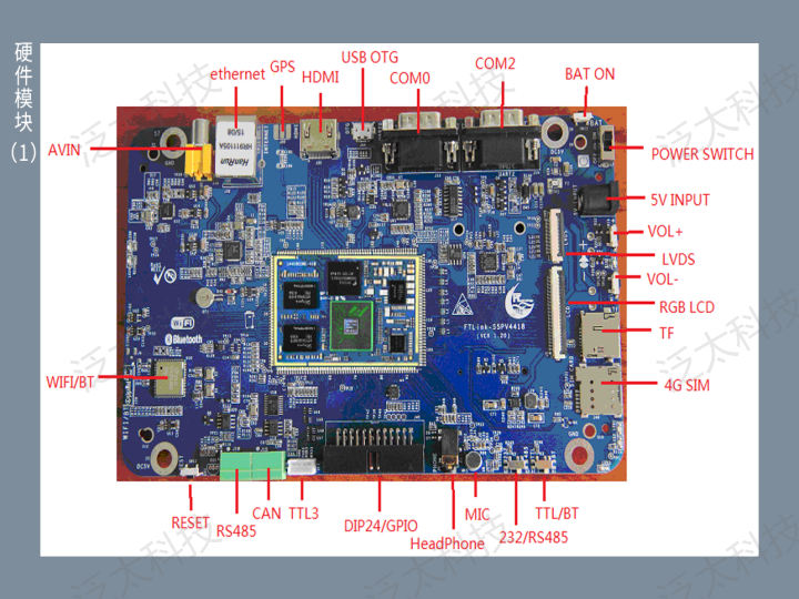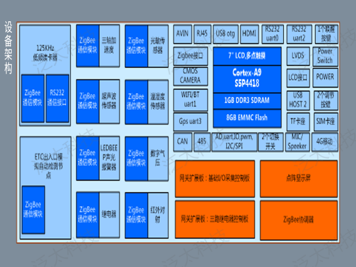 該產(chǎn)品采用ARM架構三星四核處理器S5P4418,具有7寸LCD顯示屏,集成4G移動(dòng)通信模塊、WiFi/BlueTooth二合一通信模塊、GPS衛星定位模塊、ZigBee傳感網(wǎng)模塊,板載CAN/RS485總線(xiàn)接口、豐富的外設接口以及擴展模塊。