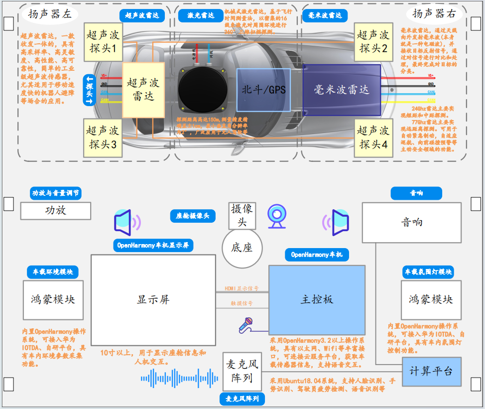 平臺包含中控計算平臺系統、鴻蒙車(chē)機及其顯示器、視覺(jué)傳感器、麥克風(fēng)陣列、音響設備、座艙艙體(含座椅、雨刮、車(chē)窗、方向盤(pán)、剎車(chē)踏板、加速踏板)、超聲波雷達、毫米波雷達等硬件,結合中控軟件系統、鴻蒙車(chē)機軟件、座椅控制程序,實(shí)現手勢識別、人臉識別、語(yǔ)音交互、駕駛員疲勞駕駛檢測、鴻蒙座椅遠程調節、雨刮車(chē)窗控制、車(chē)載傳感器監測、車(chē)機應用娛樂(lè )等功能。