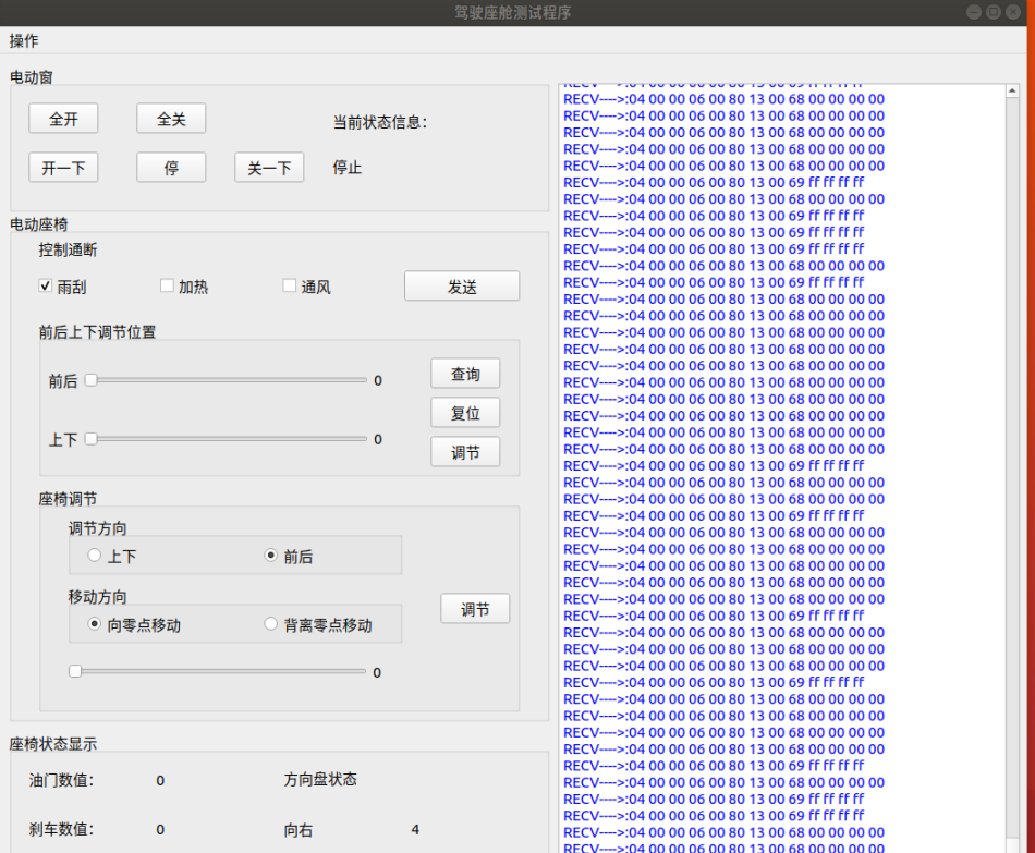 艙體,安裝了單臺主駕駛座椅、雨刮及電機、車(chē)窗及電機、方向盤(pán)、剎車(chē)踏板、加速踏板和座艙線(xiàn)控制器,通過(guò)座艙線(xiàn)控制器,接入到系統的CAN總線(xiàn)中,支持使用CAN分析工具測試艙體設備。